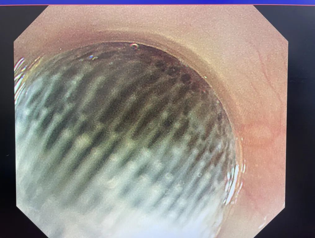 在胃镜的引导下,刘伟锋很快找到了异物。在发现异物表面光滑后,他特地选用了网兜型异物钳开展取出工作......20分钟后,异物被成功“网”出。经查,小明的食管无出血、穿孔等情况。