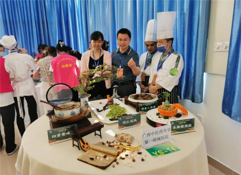为助力健康广西,营造浓厚的中医药传统文化氛围,加强中药壮瑶药药膳文化学习及应用,探索中药壮瑶药药膳推广应用,推动全区中药壮瑶医药的传承创新与发展,来自区直医疗卫生机构的15支队伍在药膳知识大赛、药膳配伍设计、药膳现场烹饪等领域进行了激烈的比拼。以大赛为机,以药膳为媒,以药膳会友。自治区中医药局规划产业处处长谷筱玉,主任科员蒋志敏等领导、嘉宾参观一附院药膳展示区,对参赛作品给予了充分肯定。一附院领导高度重视本次比赛,副院长黄仲海亲临比赛现场为队员加油鼓劲,希望参赛选手能赛出水平,赛出风采,并在赛后勉励大家再接再厉,力争在总决赛中再创佳绩!