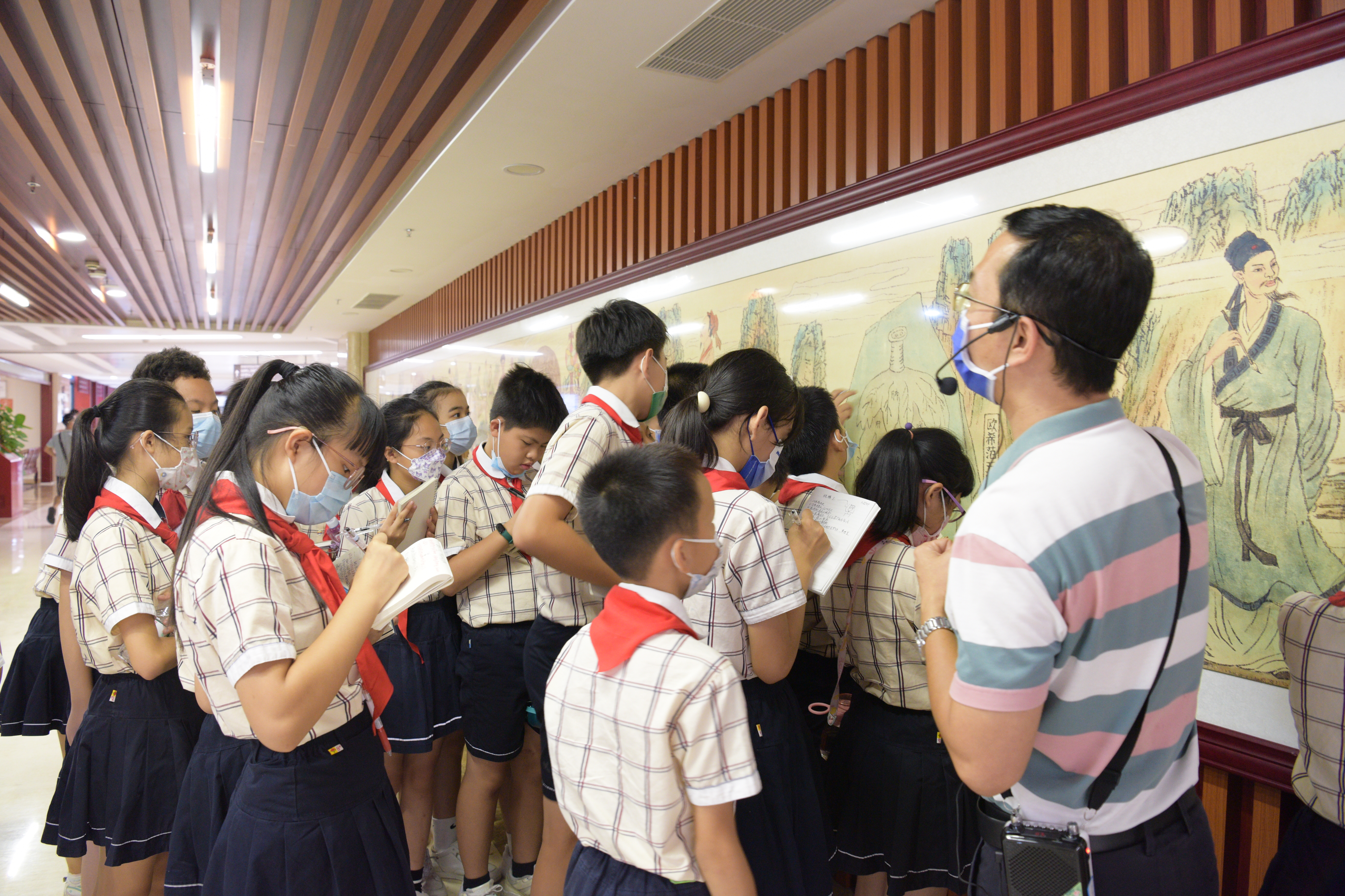 在《壮医长卷(古代篇)》手绘画廊前,两三个孩子拉在大队伍后面,驻足葛洪画像前提出疑问,学校带队老师耐心解答。