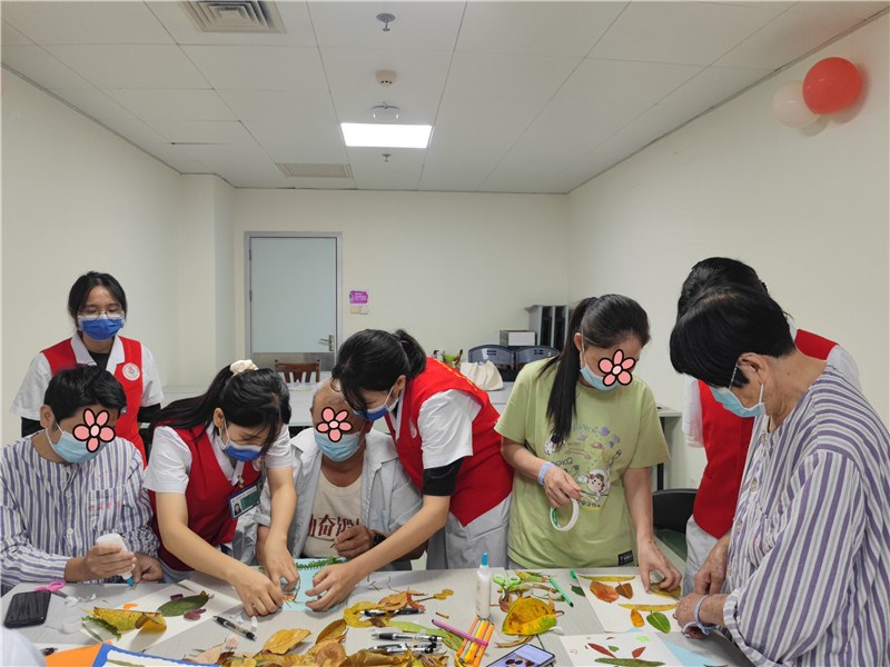 社工协助患者一起做树叶贴画创作