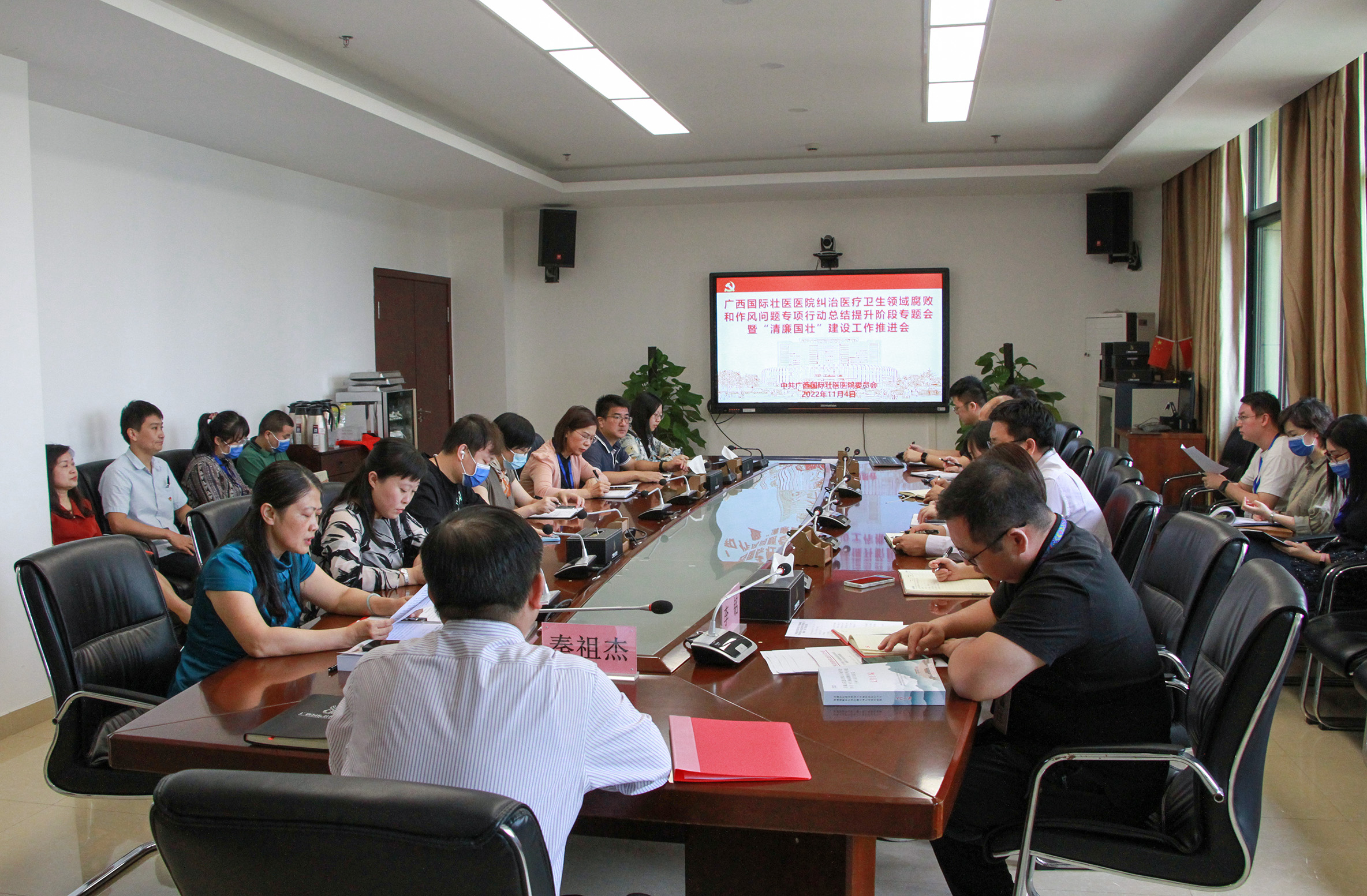 11月4日上午,附属国际壮医医院召开纠治医疗卫生领域腐败和作风问题专项行动总结提升阶段专题会暨“清廉国壮”建设工作推进会,总结阶段性工作,布置下一阶段工作任务。院党委书记秦祖杰、纪委书记罗艺徽、副院长李铭及党政职能部门负责人等参会。