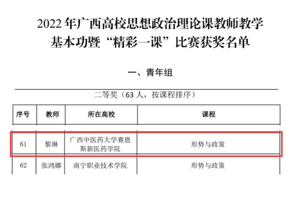 近日,从自治区教育厅关于公布的2022年广西高校思想政治理论课教师教学基本功暨“精彩一课”比赛获奖名单中获悉,赛院教师黎琳荣获2022年广西高校思想政治理论课教师教学基本功暨“精彩一课”比赛青年组二等奖。该项赛事是广西高校思政课教学领域中最具分量的比赛,是广西高校思政课教师每年进行教学研讨和教学展示的重要平台和品牌活动。