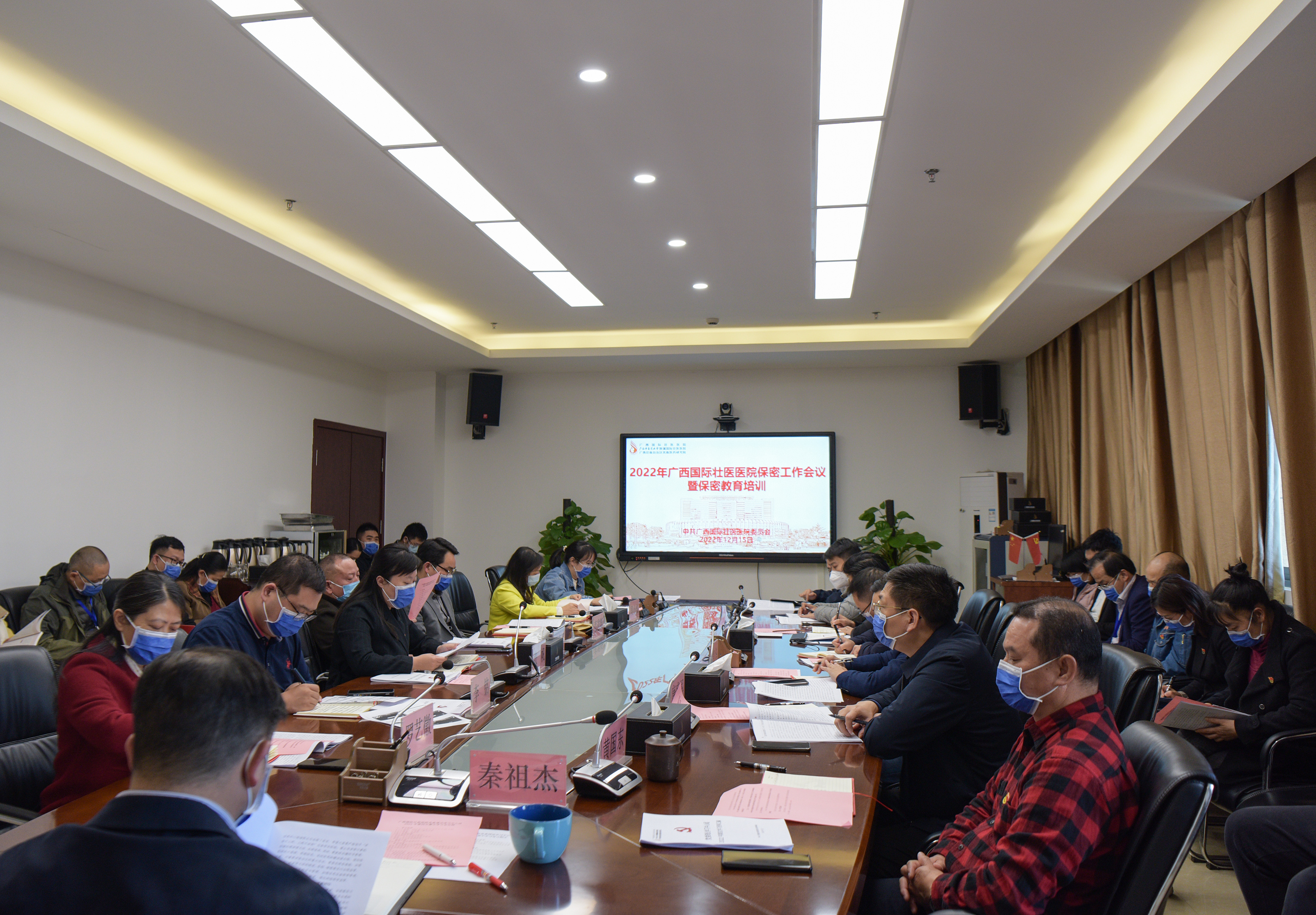 12月15日下午,广西国际壮医医院2022年保密工作会议暨保密教育培训在行政楼六楼第一会议室召开。医院党委书记、保密委员会主任秦祖杰,纪委书记罗艺徽,副院长黄国东、李铭,副院长、总会计师唐盛军及全体保密委员会成员及相关职能部门负责人参加了会议。会议由秦祖杰主持。