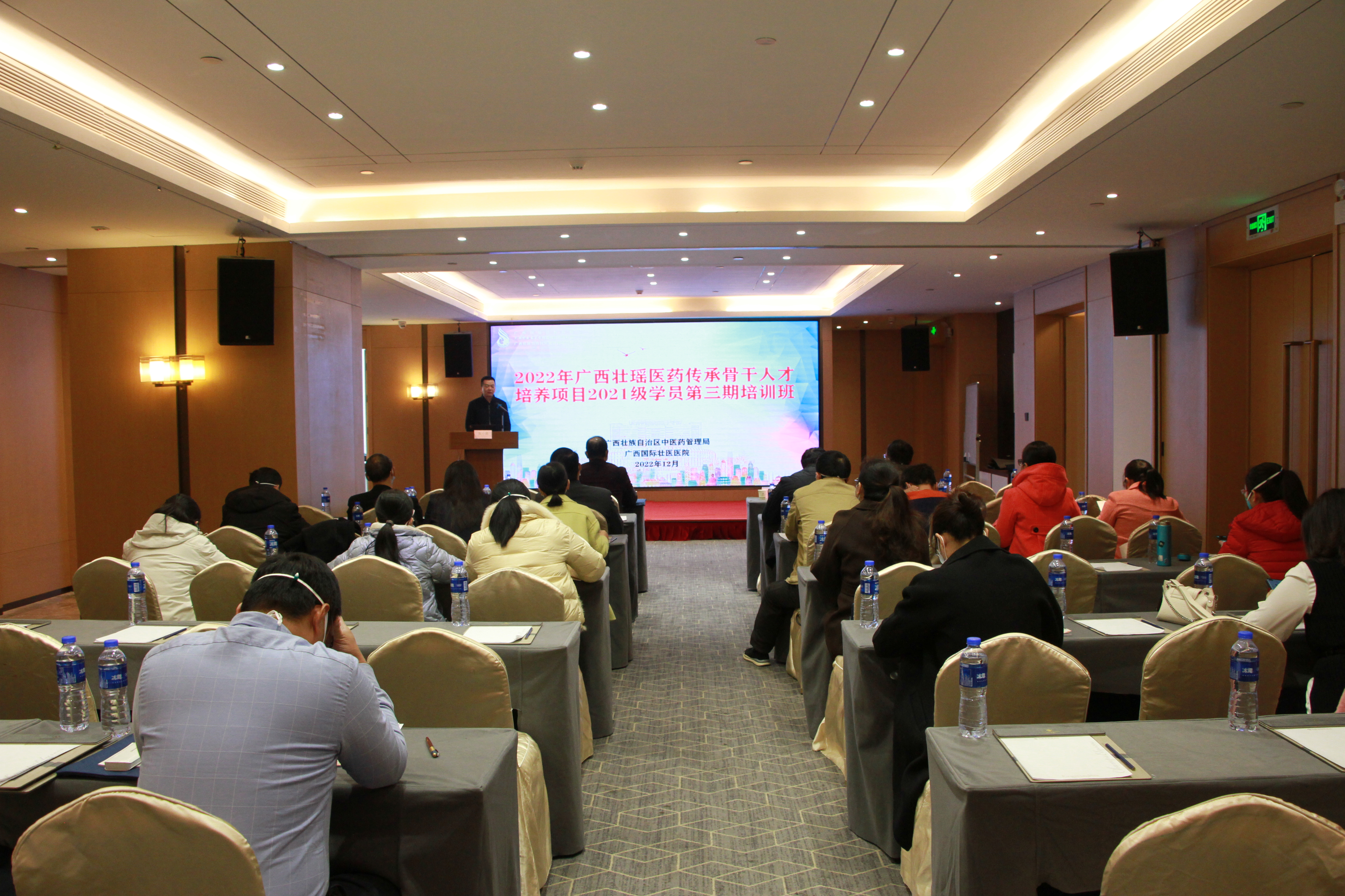 12月16日至19日,由自治区中医药局主办,广西国际壮医医院承办的2022年广西壮瑶医药传承骨干人才培养项目第三期培训班在南宁举办。自治区中医药管理局科教处处长张小磊、广西国际壮医医院副院长黄国东出席开班仪式,来自全区各医疗机构40名壮瑶医药传承骨干人才培养对象参加培训。