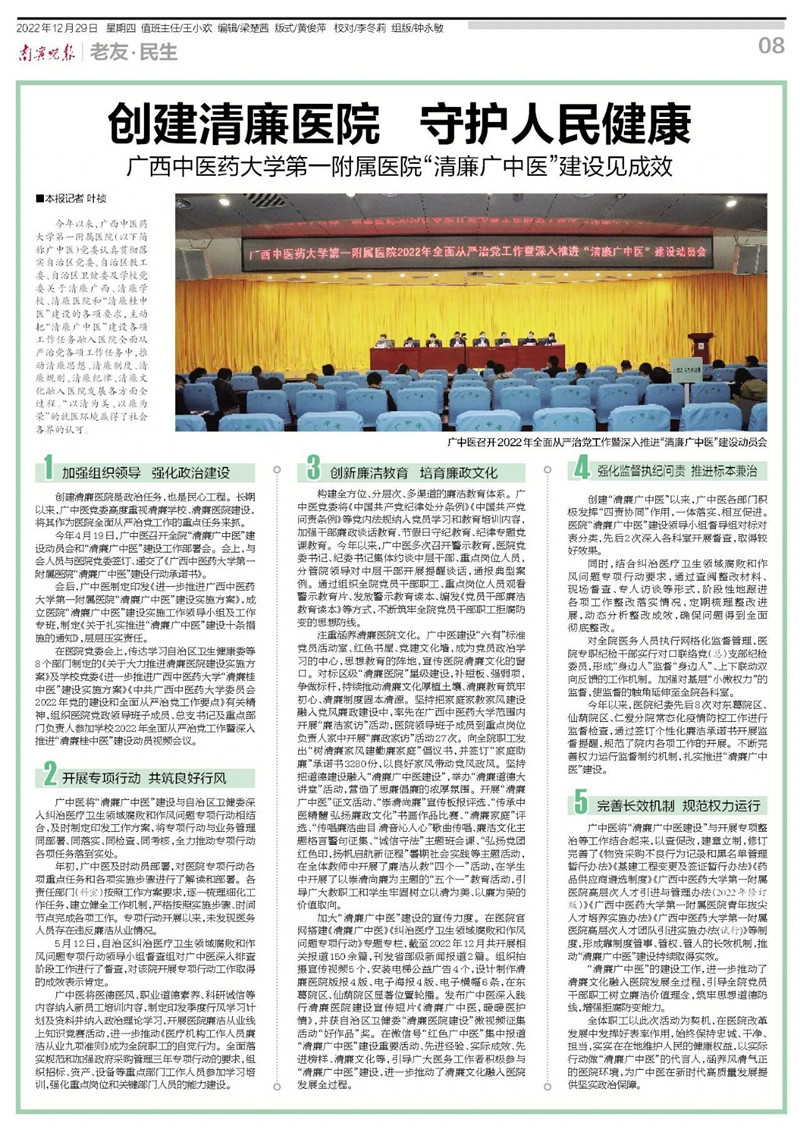 《南宁晚报》整版报道一附院“清廉医院建设”成效