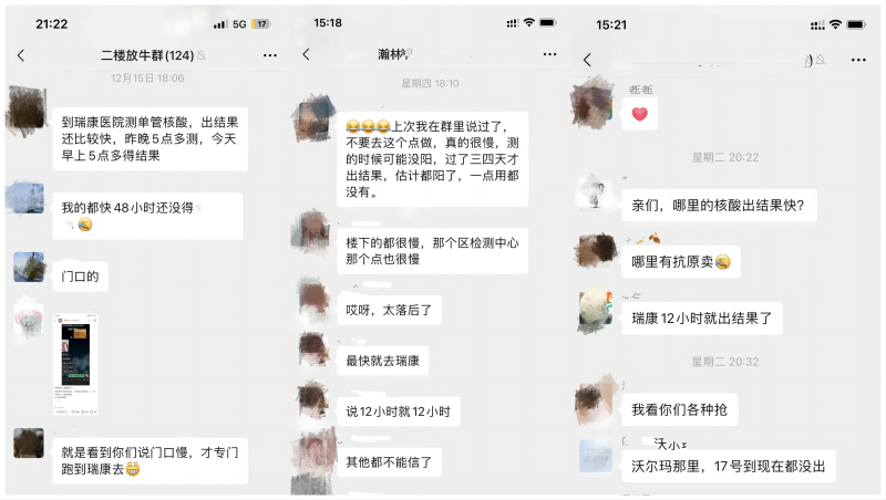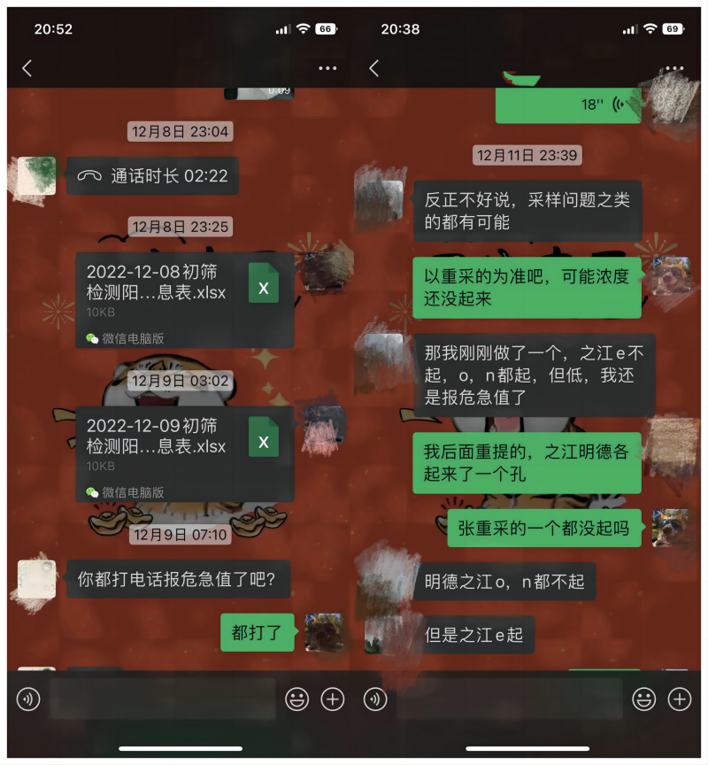 为了保证检测结果的精准性,减少重复检测的次数,核酸检测不再进行混采,只提供单人单管新冠核酸检测。实验室每天都要处理3000管以上的标本,每个班次的工作时间也从八小时延长至十二小时以上,检测组员们都是午饭、晚饭匆匆吃上两口就进入实验室开始工作。12月14日,组长罗靖下午一点就进入实验室,次日深夜一点半才完成实验检测和阳性标本数据上报工作,回到家中的她也没闲着,凌晨四点半依然在工作群里和核酸夜班的同事讨论高效推进检测工作的细节和方法;冯照谈和唐联顺两位男同志出了大夜班,上午休息后,下午就主动来实验室帮忙处理样本。
