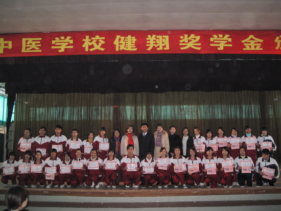 2011年1月7日下午15:30,广西中医学院附设中医学校“健翔奖学金”颁奖仪式在北湖校区隆重举行。出席颁奖仪式现场的领导嘉宾有广东佛山市健翔颈腰医院龙翔宇院长、广东佛山市健翔颈腰医院办公室冯秀娟主任、贾玲女士、广西中医学院附设中医学校吴彬校长、党委罗艺徽副书记、周琦副校长以及学校师生代表共500多人参加颁奖仪式。龙翔宇院长、吴彬校长分别作了重要地讲话。