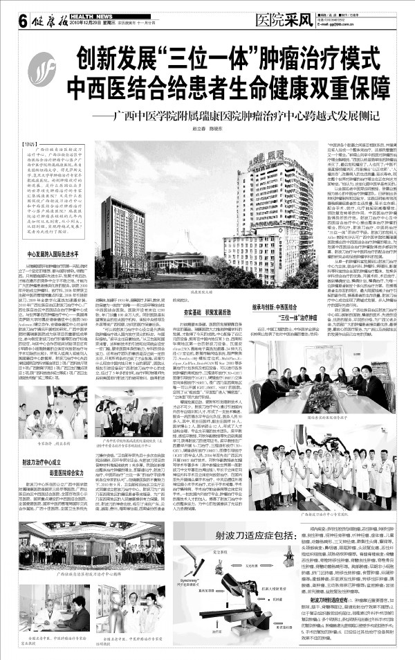 广西壮族自治区射波刀治疗中心、广西壮族自治区中西医结合治疗肿瘤中心于10月17日成立,来自美国斯坦福大学、德克萨斯大学、复旦大学等肿瘤治疗专家齐聚瑞康医院,论剑肿瘤放疗的新进展。瑞康医院创新发展“三位一体”肿瘤治疗新模式得到专家和广大患者的认可,《健康报》2010年12月28日第六版“医院采风”栏目全版报道瑞康医院肿瘤治疗跨越式发展,充分肯定瑞康医院在肿瘤治疗的先进理念和独特疗效。