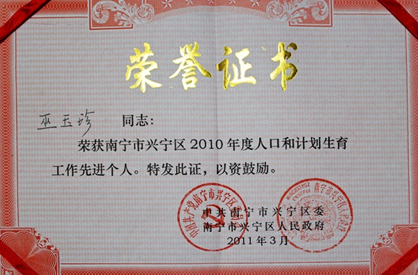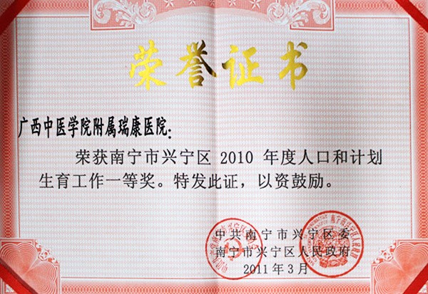 瑞康医院荣获2010年区间城市人口计生工作考核评估一等奖 来源:瑞康医院 作者:赵立春 覃华芳 日期:2011-03-16 点击数: 次 分享到: 2010年3月7日,南宁市兴宁区党委、政府决定对2010年区间城市人口计生工作目标责任制党政线、计生线、部门线执行情况考核评估获奖单位给予通报表彰。瑞康医院荣获考核评估辖区单位组一等奖;瑞康医院预防保健科巫玉珍同志获“兴宁区2010年人口计生工作先进个人”荣誉称号。 获奖证书 获奖证书 (瑞康医院 赵立春 覃华芳) 打印正文 关闭本页