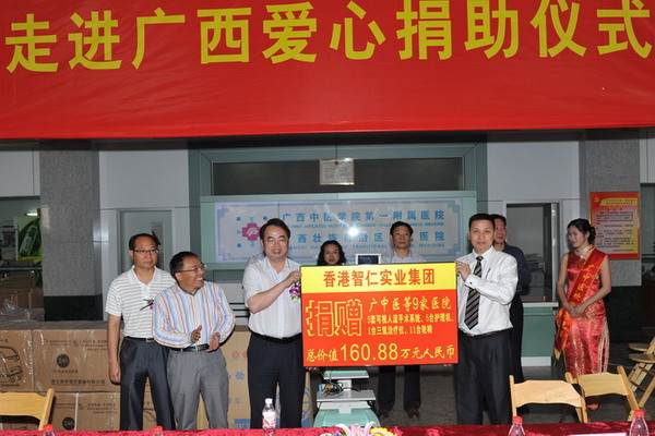 此次捐赠,由香港智仁实业集团有限公司、东莞微视医疗科技有限公司等爱心企业提供的价值120万的五套可视人流手术系统,分别捐给广西中医学院第一附属医院、广西壮族自治区人民医院、南宁市妇幼保健医、柳州市人民医院及龙胜县人民医院,同时来宾市中医院、田东县中医院等4家中医医疗机构分别受赠价值6万元人民币的中慈天使·老年护理机一套。为支持广西慈善事业,中华慈善总会大众慈善基金会向广西慈善总会捐赠5套老年护理机及一台三氧治疗仪,总价值62万元人民币。此次捐赠活动对改善我区部分医疗机构医疗设备配置,提高基层医疗卫生服务机构、福利机构的服务水平,让广大的妇女、残疾人及老年人享受到更多优惠、贴心的服务有积极促进作用,引起群众较大反响及媒体广泛关注。