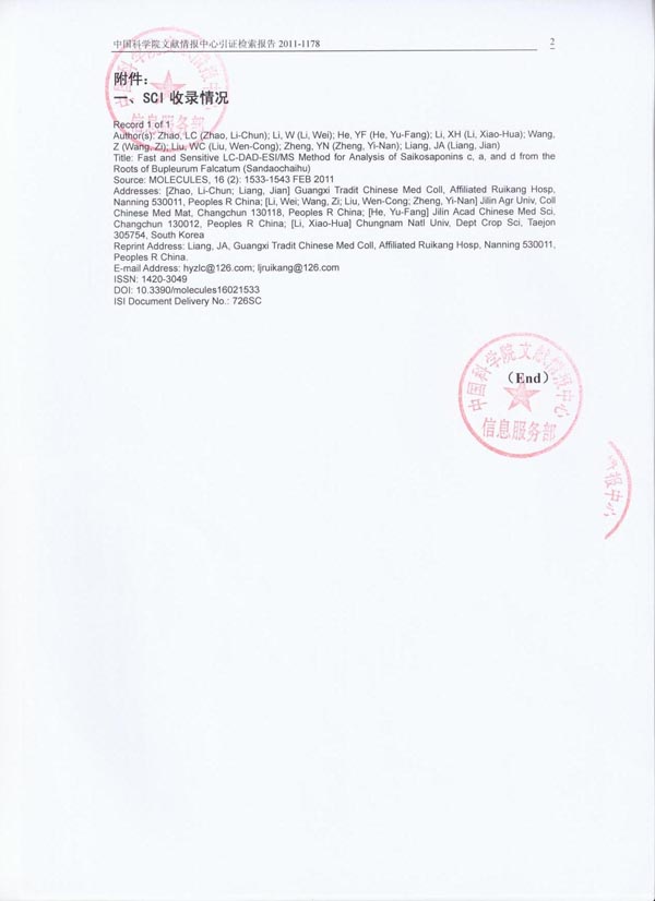 此研究成果于2011年2月11日发表在SCI收录杂志,瑞士《Molecules》杂志,影响因子1.738。