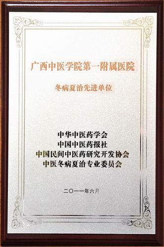 一直以来,广西中医学院第一附属医院根据中医“冬病夏治、夏病冬防”,“子午流注、适时开穴”的传统理论,总结多位老中医数十年的临床经验,经过不懈的努力,研制出“伏九贴敷膏散”,在每年“三伏”、“三九”在之时开展“三伏贴”治疗各种免疫力低下的秋冬季容易复发和加重的疾病。通过治疗能使患者整体性体质全面好转,免疫力得到增强,发病次数减少,发病程度减轻甚致不易复发,深受广大患者欢迎。在第二届全国中医冬病夏治学术交流大会中获此殊荣,实至名归。