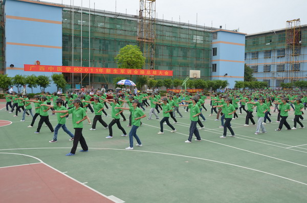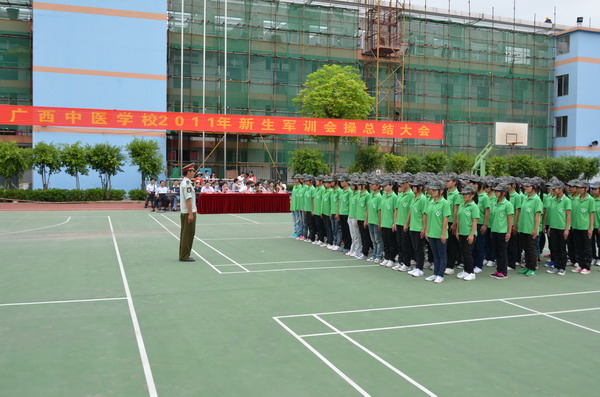 2011年8月25日上午,阳光明媚,微风轻拂,广西中医学院附设中医学校2011年新生军训会操总结大会在北湖校区运动场隆重举行。附设中医学校党委岑家铭书记,罗艺徽副书记,周琦副校长,林原副校长,新黄埔青少年军校南宁办事处张克胜主任出席本次大会,会议由罗艺徽副书记主持。