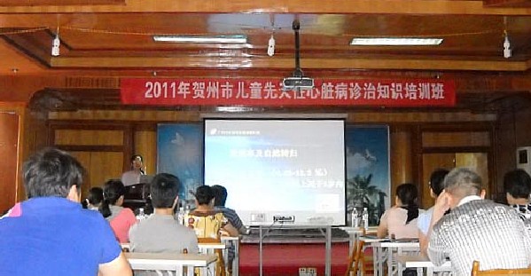 专家们到达贺州后,首先在贺州市人民医院多媒体教室进行关于儿童先天性心脏病诊治知识的讲学,学员都是来自贺州市人民医院、贺州市广济医院、钟山县人民医院、富川县人民医院、昭平县人民医院心胸外科、心血管内科、超声科的骨干医师。贺州市卫生局新农合管理办公室主任黄志林主持开班仪式,对瑞康医院专家教授的到来表示热烈欢迎,并希望学员们加强学习,共同为贺州市的先心救治工作贡献自己的力量。瑞康医院心胸外科吴文森主任、心血管内科何劲松主任、超声科唐昂主治医师分别就先天性心脏病的诊断、治疗及超声检查进行了详细讲解,学员们对于专家们的讲课也给予了充分的评价。