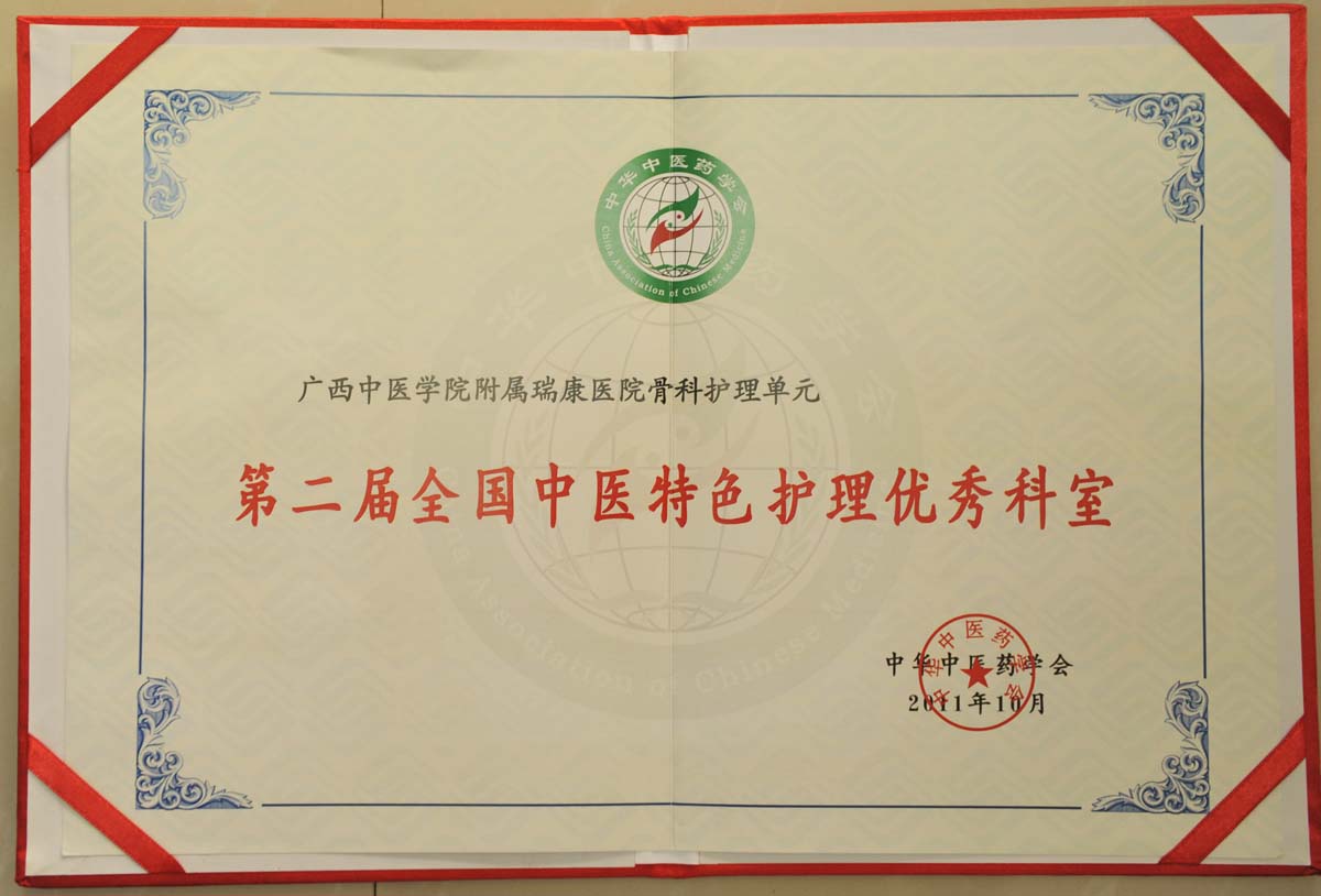 2011年10月9日-12日,由中华中医药学会主办的全国第二届第三次中华中医药学会中医护理学术交流会议暨全国中医特色护理优秀科室表彰大会在安徽黄山召开。大会评选出“第二届全国中医特色护理优秀科室”,瑞康医院骨科喜获“第二届全国中医特色护理优秀科室”荣誉称号。