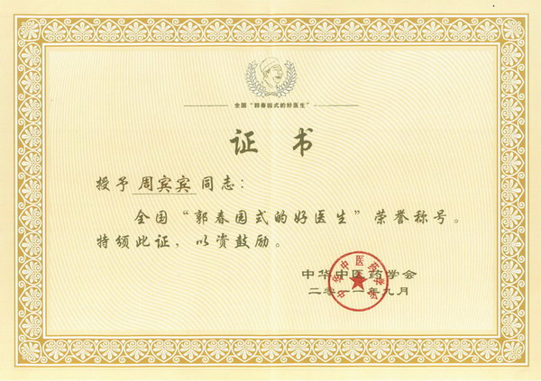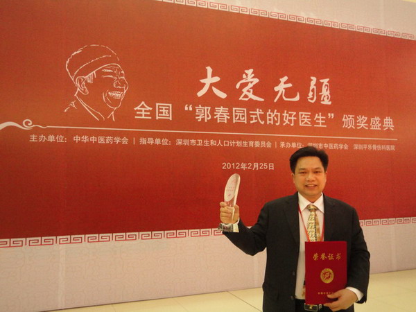 2012年2月25日下午,全国“郭春园式的好医生”颁奖庆典在深圳大剧院举行,来自全国各地中医药界的翘楚、知名专家齐聚深圳。国家卫生部副部长、国家中医药管理局局长王国强,深圳市人大常委会副主任蒋宇扬、副市长吴以环、市政协副主席林洁等出席庆典并为获奖人员颁奖。一附院医务部主任周宾宾医生凭借精湛的医术以及优良的医德获此殊荣。