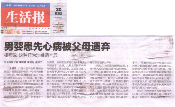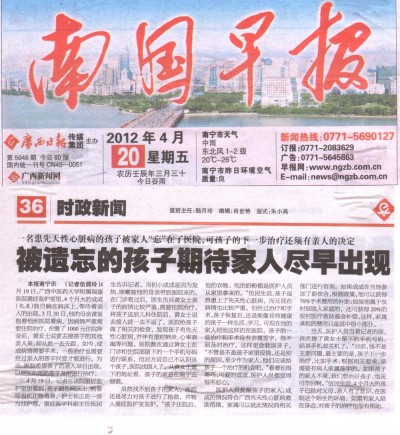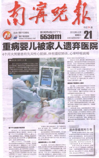 4月19日,在该院重症监护室里,孩子躺在病床上,插着呼吸机正睡得香,护士长正在一旁为他护理。重症医学科副主任伍民生告诉记者,当初小勇是因为发热、咳嗽被他的母亲带到医院来的。在门诊看过后,医生告诉黄女士孩子的病情比较严重,需要住院治疗。将孩子送到儿科住院后,黄女士说去接人就一去不返了。医院给孩子做了相关的检查,发现孩子有先天性心脏病,并伴有重症肺炎、心率衰竭等问题。医院数次通过黄女士在门诊和住院部留下的一个手机号码进行联系,但对方说自己不认识这个孩子,医院找错人了。从黄女士留下的地址看,孩子的家是在南宁五塘镇。