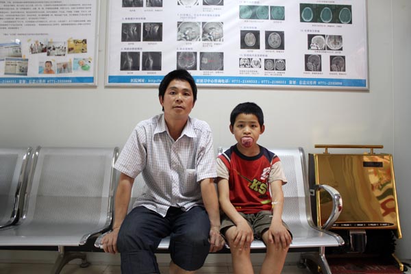 2012年5月4日早上,在瑞康医院住院的男孩国国的巨舌接受了一次“射波刀”的治疗,就不流口水了。国国父亲看到这一幕,脸上露出了笑容。