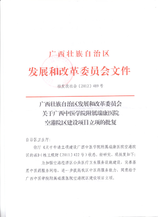 喜讯——瑞康医院空港院区获得广西壮族自治区发展和改革委员会建设项目立项批准 来源:瑞康医院 作者:信息宣传科 日期:2012-05-23 点击数: 次 分享到: 瑞康医院空港院区的建设紧紧围绕中医药民族医药事业与产业联动和协调发展的模式来开展空港院区的发展,围绕“十二五”医改规划目标任务,以基本医疗卫生制度建设为核心,创新体制机制,加快推进县级公立医院改革步伐。 广西发展和改革委员会同意给予广西中医学院附属瑞康医院空港院区建设项目立项。 打印正文 关闭本页