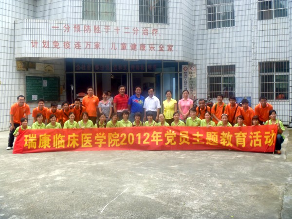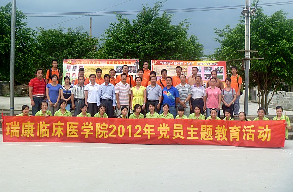 为继承和弘扬党的优良传统和作风,牢记全心全意为人民服务的根本宗旨,充分发挥共产党员的模范带头作用,在党的十八大召开、七一建党节即将到来之际,瑞康临床医学院教务学生党总支组织2012届毕业生党员代表、在校生党员代表、新党员代表35人在瑞康临床医学院教务学生党总支副书记王瑜老师、纪检委员秦明芳老师、组织委员汪国翔老师及宣传委员韦怡老师的带领下,于2012年6月14日赴南宁市隆安县南圩镇开展“传承 感恩 跨越”党员主题教育活动。