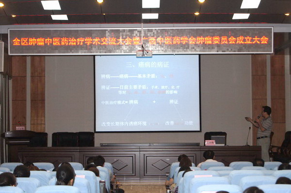 2012年06月30日,由广西中医药学会主办、广西中医学院第一附属医院肿瘤血液病科承办的“广西全区肿瘤中医药治疗学术交流大会暨成立广西中医药学会肿瘤专业委员会”在美丽的绿城南宁隆重举行。会议由一附院科技部冯纬纭教授主持,副院长韦艾凌博导致欢迎词,广西中医药管理局常务副局长庞军博士到会并发表了重要的指导性讲话。中华中医药肿瘤学会会长周宜强教授、广州中医药大学第一临床医学院肿瘤科主任林丽珠博士,北京中医药大学东方医院博士生导师胡凯文教授、我院韦艾凌教授、王家晓教授分别做了精彩的学术报告。来自全区各地市的300余医务工作者出席会议。