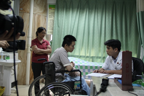 近日,经电视、报纸、网络等多家媒体的报道和转载,大新县“最美继母”许爱梅不离不弃照顾瘫痪继子许鹏的先进事迹,引起了社会很多人的关注。在得知许鹏一家的情况后,一直致力于公益事业的瑞康医院伸出了援助之手,免费为许鹏做了一个全面的体格检查。2012年7月2日,在大新县残联、大新县人民医院、广西电视台卫星频道《让爱住我家》栏目组及社会各界爱心人士的帮助下,许妈妈和许鹏来到了瑞康医院,医院对许鹏进行了CT、肌电图、B超等一系列检查。神经内科三区陈晓锋副主任耐心细致地为许鹏进行常规检查,并结合CT、肌电图、B超等检查结果给许鹏有针对性地提出了康复的意见和建议。