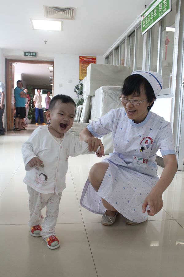 手术后的小倩倩恢复得非常好,黄成股长来医院接她出院时,护士张红长正扶着她在走廊上练习走路,见到护士长拿出她手术前的相片,小倩好奇地睁大眼睛,用手抓过照片,看了两眼后发现照片里的人就是自己,咯咯地笑个不停。