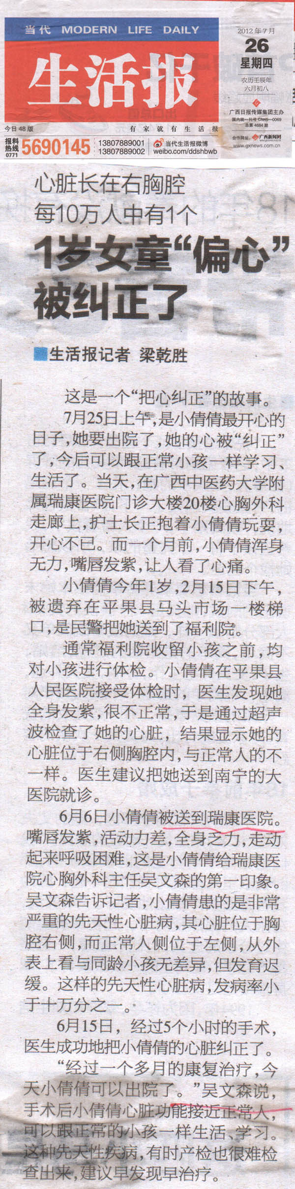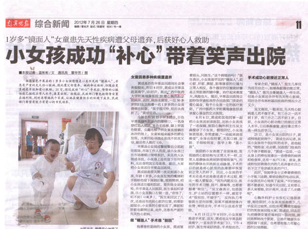心脏长在右边,还伴有先天性心脏病,这个几率是非常低的,但却让不幸的平果县女婴小倩倩遇上了,更不幸的是,她被自己的亲生父母抛弃了。然而,小倩倩又是幸运的,因为在平果县民政局和瑞康医院的帮助下,她成功进行了手术,并于2012年7月25日出院了。手术前从来没笑过的小倩倩,和大人们一起玩时开心地咯咯咯笑了。