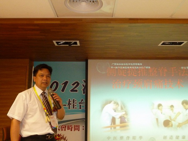 7月28日上午, 由广西中医药学会、台北市中医师公会联合举办的“2012海峡两岸中医药学术研讨会-广西•台湾传统医药专病专法交流论坛会”在台北市中医师公会会议厅举行,会上周宾宾主任做了“侧旋提推整脊手法治疗颈肩痛技术”专题讲座并现场做了手法演示,讲课突出实用性及有效性,手法演示简单易懂易学,为两岸同行介绍了我院独具特色、行之有效的推拿技法,两岸医师反应强烈,同台互相交流经验、介绍心得。黄雪霞主任在会上作了“中医治疗慢性肾炎的优势”专题讲座,介绍了目前大陆中医治疗慢性肾炎的方法及优势、我院治疗本病的经验及手段,讲课内容深受台湾同行的好评。会后台湾各级医院纷纷询问我院的等级设置、医院规模、人才培养、进修要求等,表示将进一步加强交流,选派医师到我院进修学习。