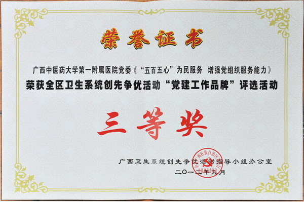 一附院在创先争优活动中创建的《三个优化 三个创新 增强党组织战斗力》和《“五百五心”为民服务增强党组织服务能力》的党建工作品牌分别荣获了全区卫生系统创先争优活动“党建工作品牌”评选活动一等奖和三等奖。