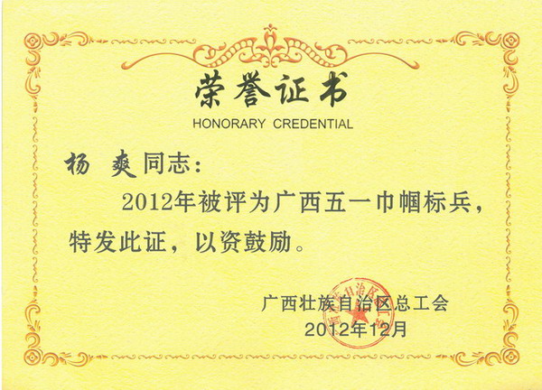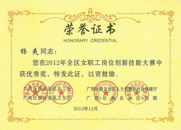 杨爽荣获全区女职工岗位创新大赛优秀奖