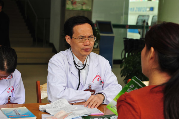 肾内科主任黄仁发在认真倾听前来咨询的病人诉说情况