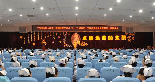 2013年5月6日下午,一附院在医院多功能学术厅举办以“点燃生命的太阳”为主题的“5.12”国际护士节庆祝表彰大会暨新护士授帽仪式。医院院长黄贵华,党委副书记、纪委书记、副院长吴西西,副院长卢健棋、桂雄斌、周建国、钟远鸣等领导出席了本次庆祝表彰大会,各职能部门和临床科室的主任、离退休护理前辈,全院500余名护士及48名新护士参加了会议。