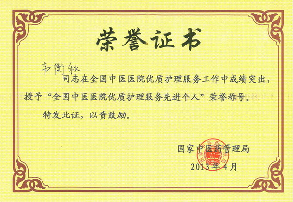 一附院护理部主任韦衡秋荣获“全国中医医院优质护理服务先进个人”称号