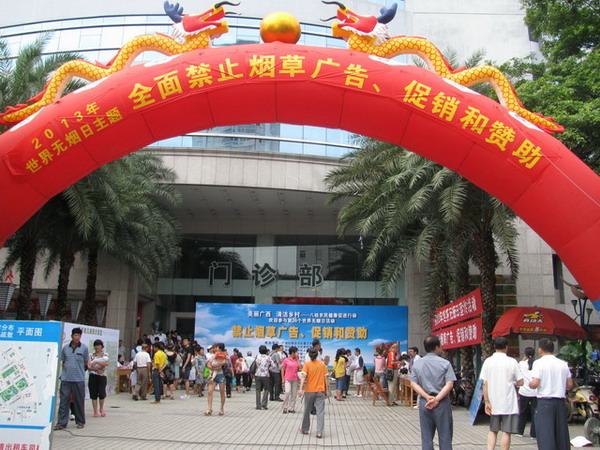 2013年5月31日是第26个“世界无烟日”,本次世界无烟日宣传活动的主题是“全面禁止烟草广告、促销和赞助”。由自治区卫生厅爱卫办和自治区疾控中心主办的世界无烟日宣传义诊活动在自治区人民医院门诊大楼前举行,广西医科大学第一附属医院、广西区人民医院、南宁市第一人民医院等医疗卫生机构均派出了宣传小组,星空彩票老版本下载第一附属医院戒烟医师陈平和健康教育宣传员冯英华参加了此次宣传义诊活动。