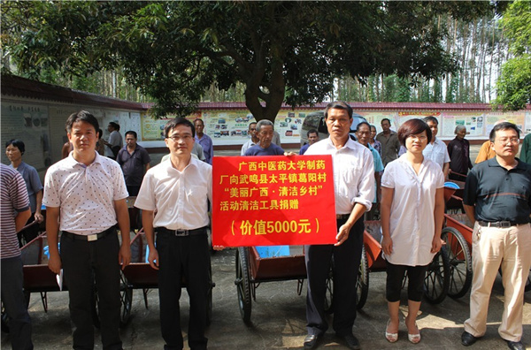 9月17日上午,药厂党委书记蒋林带领药 厂部分党支部书记及党政办一行7人前往我校“美丽广西·清洁乡村”活动联系村——武鸣县太平镇葛阳村,为该村捐赠清洁工具、药品并看望药厂驻村干部李汉东同志。此行制药厂共向驻点村捐赠清洁垃圾车17辆,向驻点村卫生所捐赠药品一批,总价约一万余元。