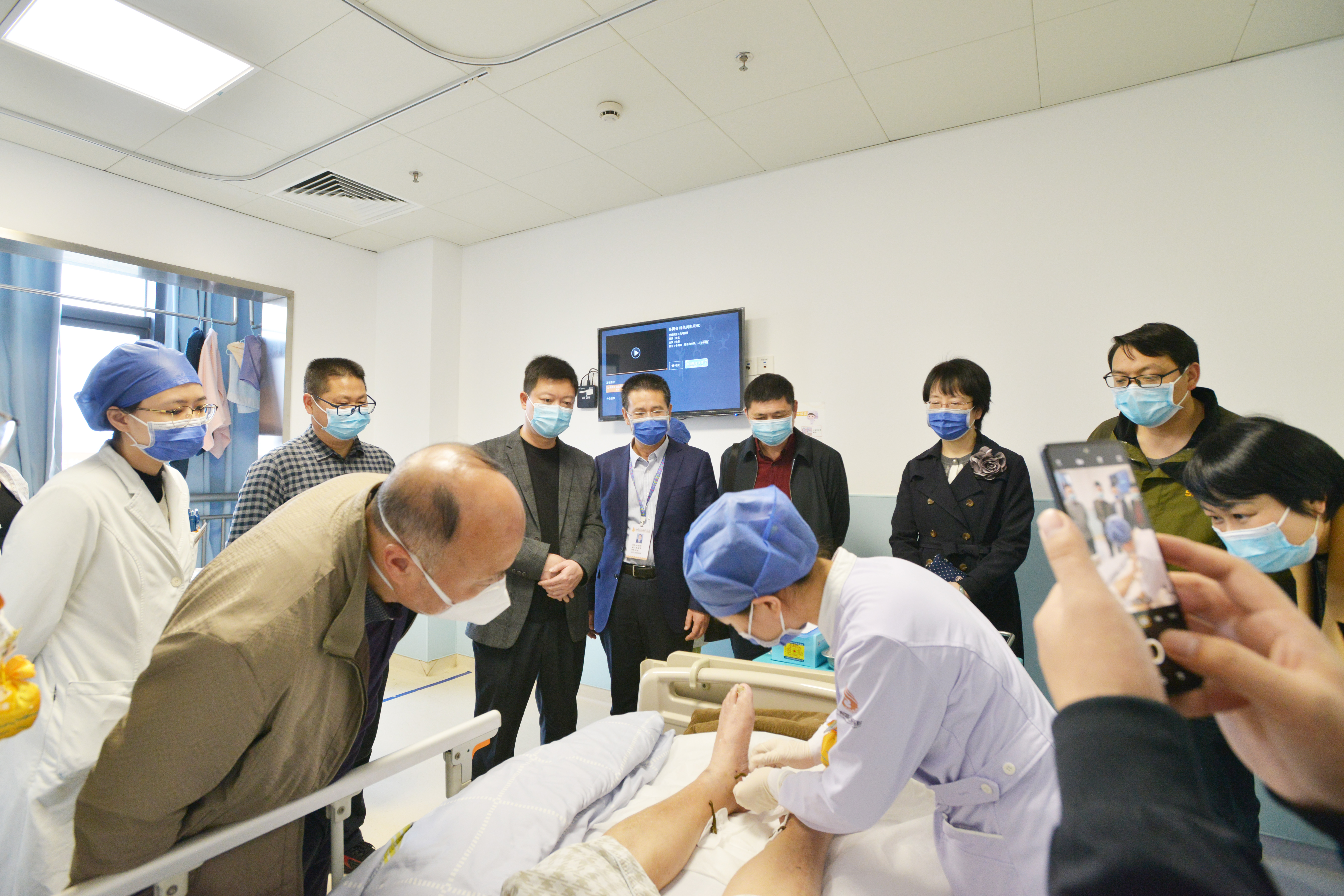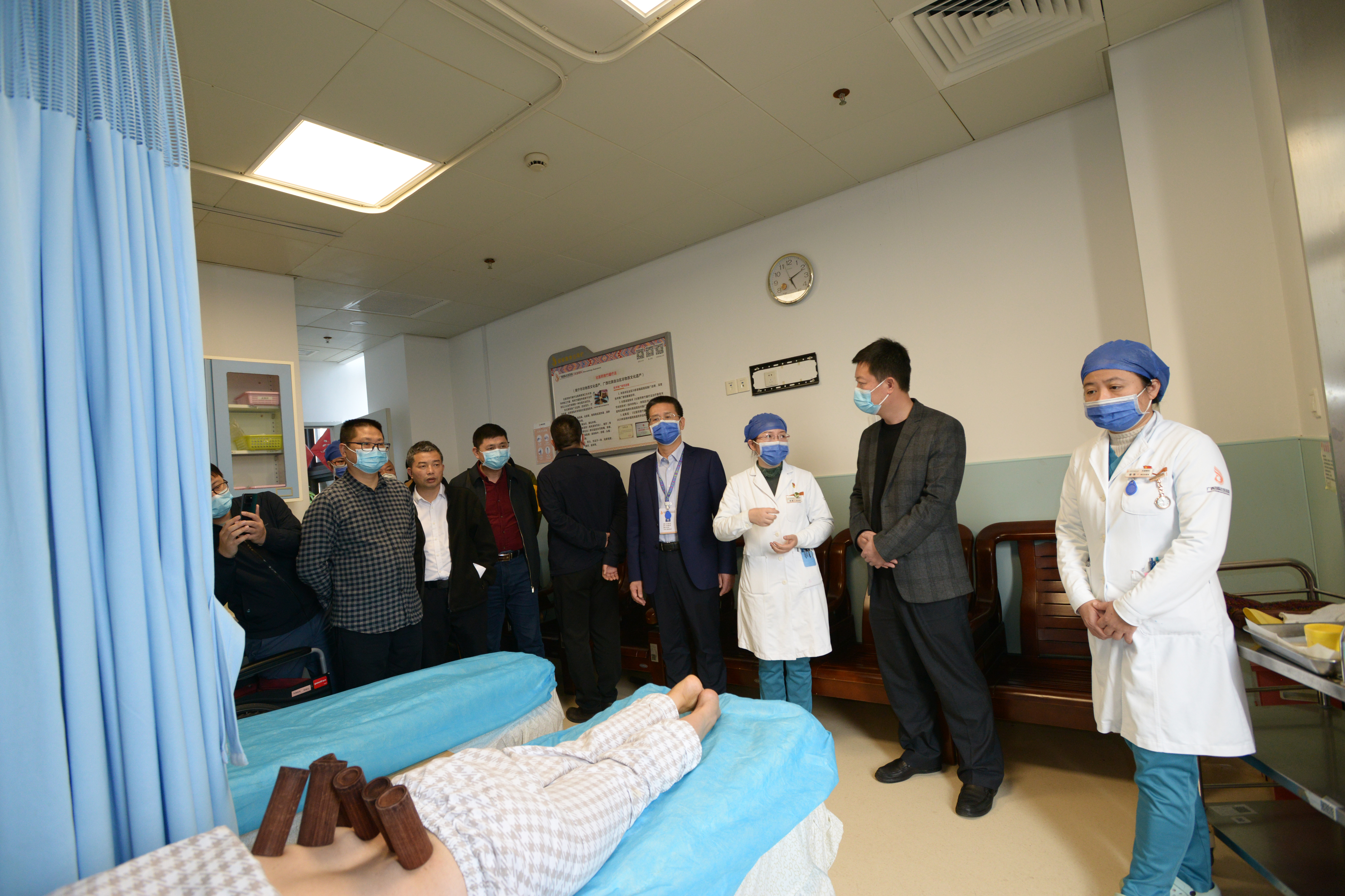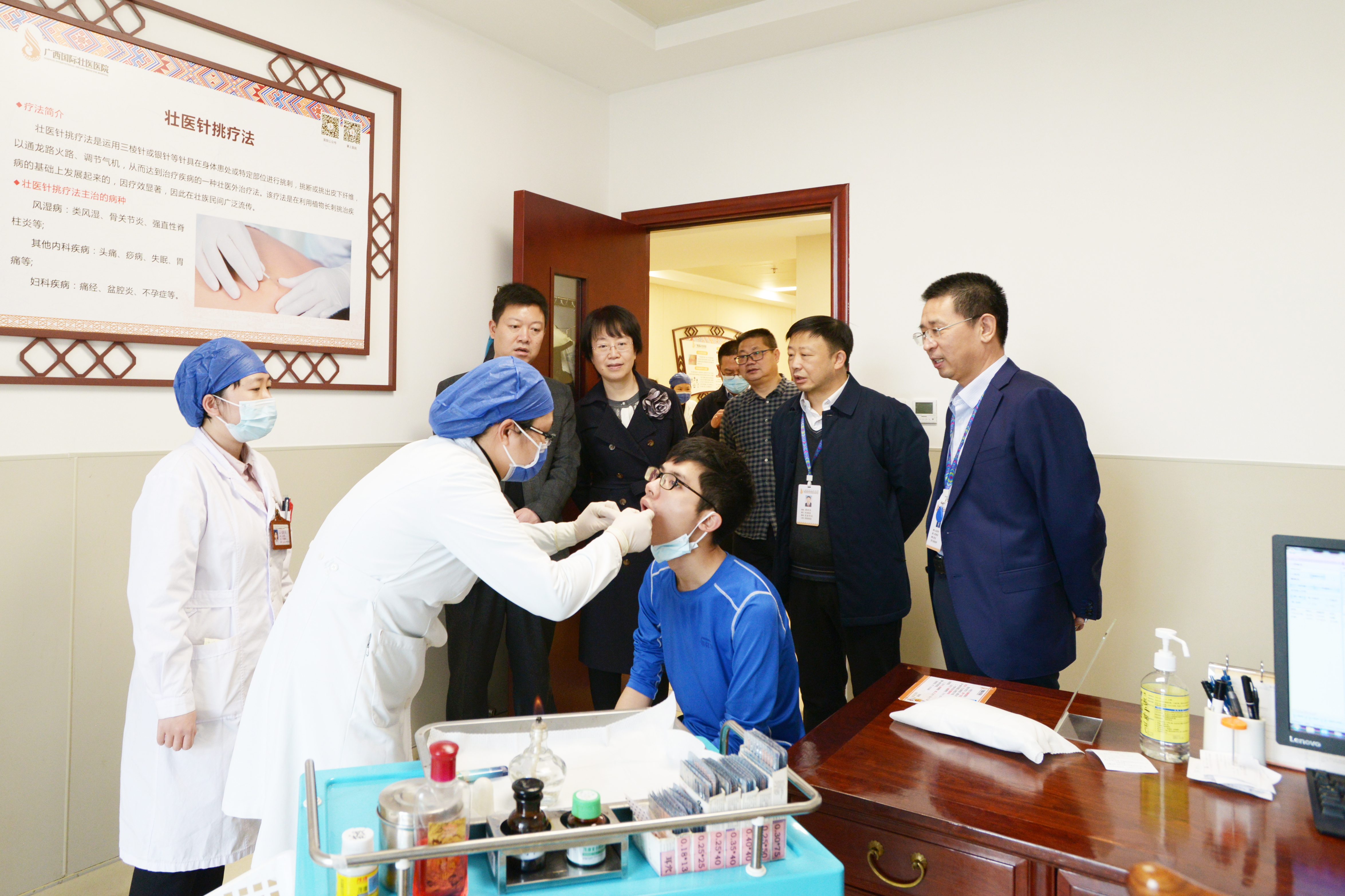 当日,肖志勇一行先后到门诊大厅、民族医学特色诊疗中心、治未病中心、空中花园(壮锦苑),风湿病科、壮医经典病房住院部等处参观,实地了解医院规划建设、民族医药文化、壮瑶医药特色技法、人才建设等情况。