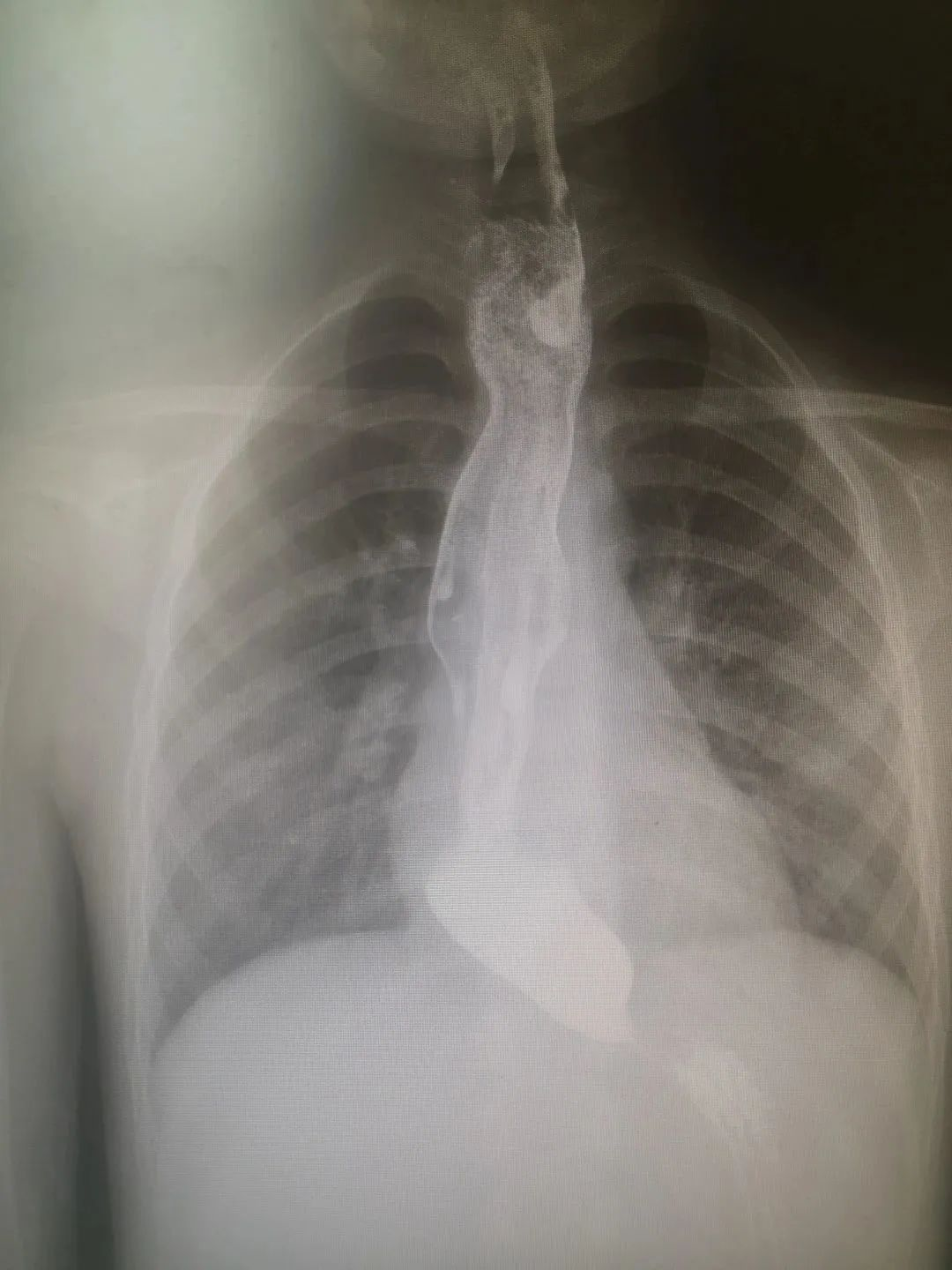 食道造影显示该患儿食道下端有鸟嘴样改变,食道下端扩张
