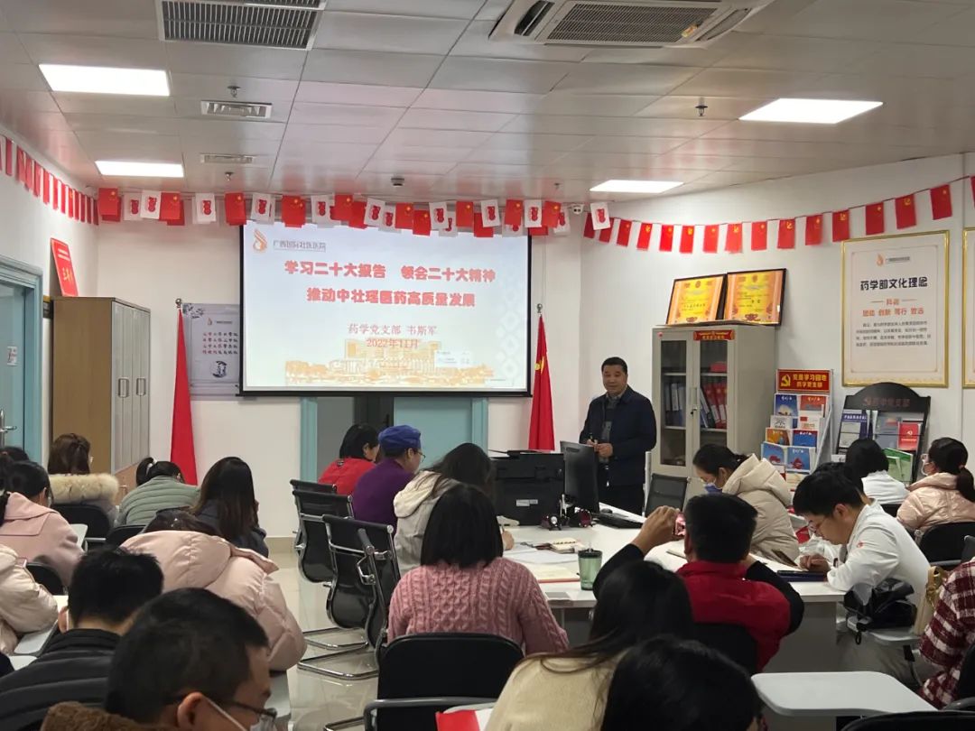 2023年2月7日,支部开展党的二十大精神专题学习党课并结合壮瑶医药发展、“健康中国建设”等实际工作展开探讨。韦斯军以“学习二十大报告、领会二十大精神、推动中壮瑶医药高质量发展”为题授课,围绕深入学习大会报告、深刻领会二十大精神、推动中壮瑶医药高质量发展三个部分,宣讲党的二十大精神要义。他表示,支部要不断加强“‘药’有担当”的品牌建设,在新时代新征程中,坚定文化自信,充分发挥中壮瑶医药在预防、治疗中作用,广泛宣传健康科普知识,做出应有贡献。