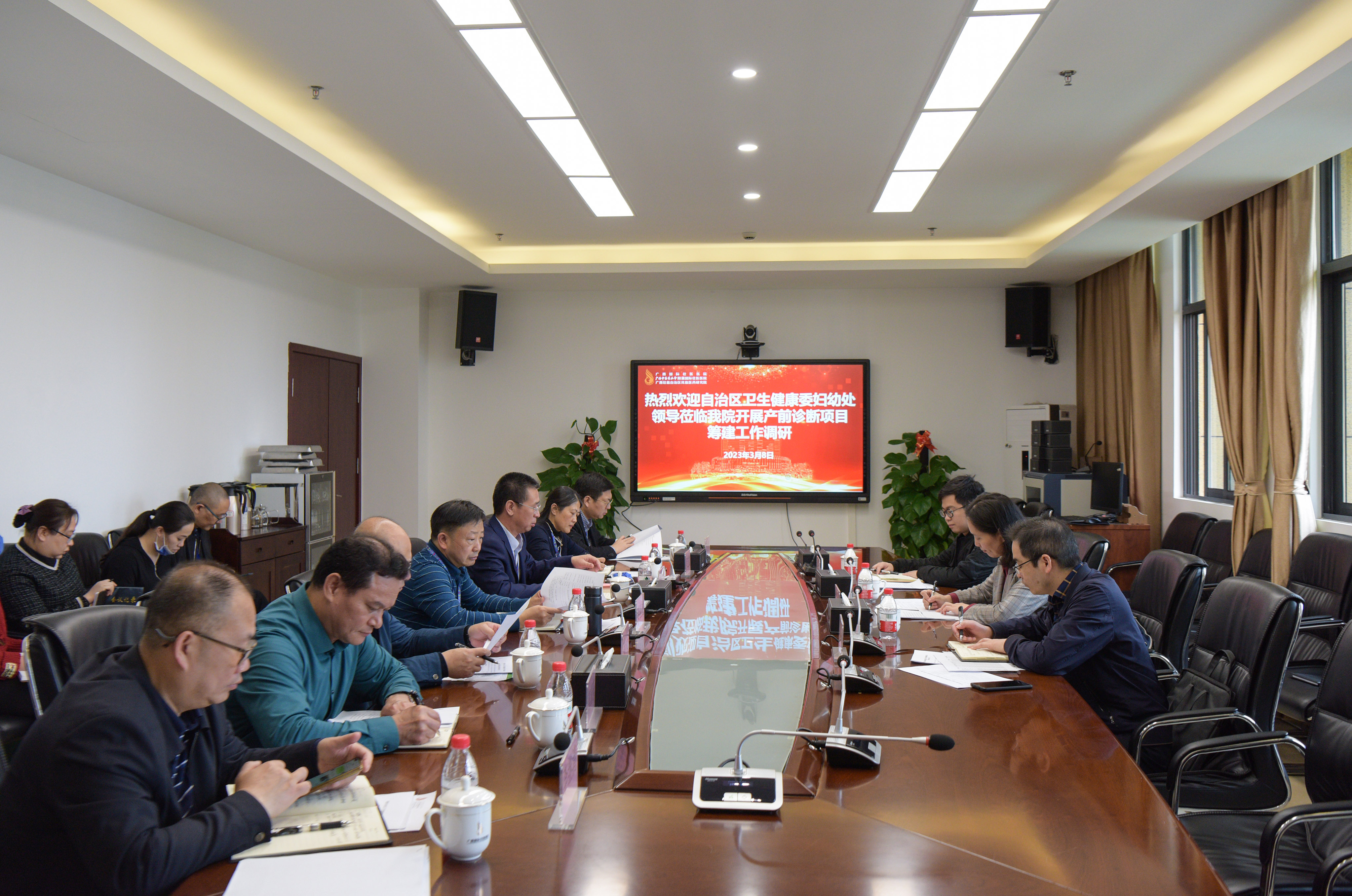 3月8日上午,自治区卫生健康委妇幼处处长陈赤带队到附属国际壮医医院开展产前诊断项目筹建工作调研并召开座谈会,医院党委书记秦祖杰、院长岳桂华等在家领导班子成员及相关部门负责人参加。