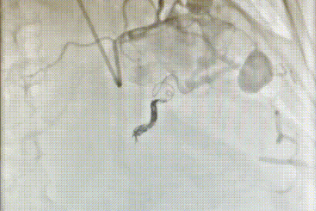 完善治疗前准备后,徐先增团队于28日为赵奶奶实施了介入治疗。治疗中,徐先增细致操作,将出血的4个动脉瘘一一定位,用8个弹簧圈将它们补上,顺利完成止血,过程中未对血管造成任何伤害。经查,赵奶奶的动脉已不再出血。