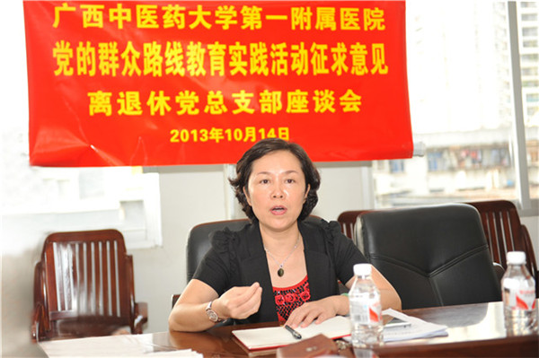2013年10月14日,一附院党委书记李敏智率党办、工会离退科、离退休党总支部负责人组织召开了党的群众路线教育实践活动征求意见离退休党总支部座谈会。一附院离休老干部、老党员、老领导、医护药技老专家、老工人等代表参加了座谈会。