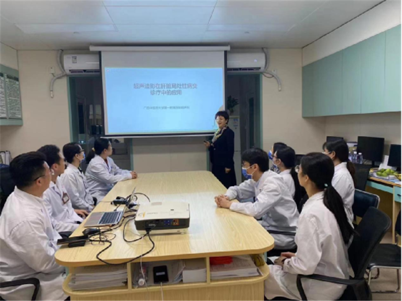 活动现场,超声科主任刘雪玲向参会的党员同志们讲解了超声造影在肝脏占位性病变诊疗中的应用与优势,并以实际的临床案例逐一向大家介绍超声造影在肝癌、肝硬化结节、肝囊肿、炎性局灶病变等疾病的诊断和治疗中作用。随后,与会的同志就该项技术以及超声引导下肝癌射频消融、肝穿刺活检、肝脓肿引流、胆道引流等技术的应用展开了深入的讨论,充分认识到新技术、新手段对学科和临床发展的推动作用。