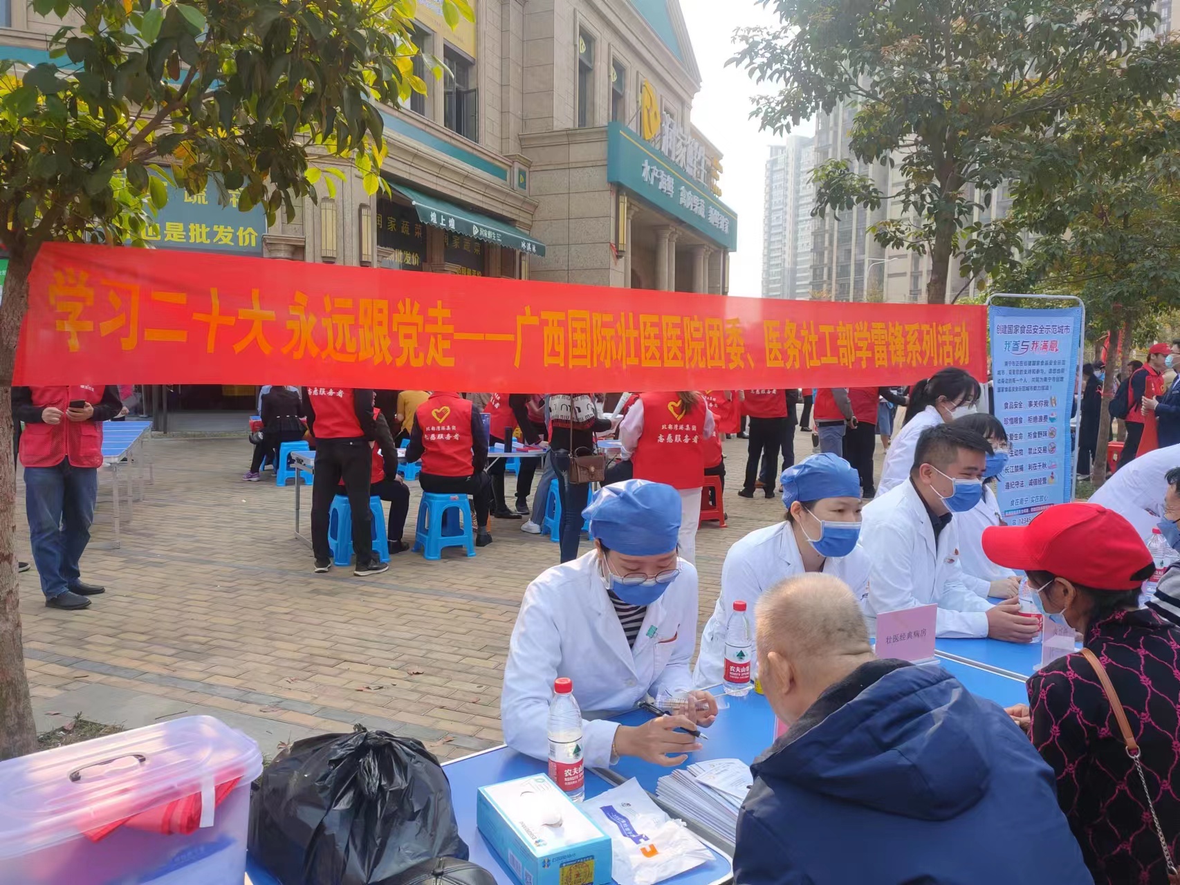 3月2—3日,医院团委、医务社工部联合医院外联部组织20余名青年党员、团员、志愿者们分别在南宁市广源华府社区、银海大道中通快递服务点开展以“学习二十大 永远跟党走”为主题的学雷锋便民义诊志愿服务活动,用医学专业知识为民办实事,为群众解难题。