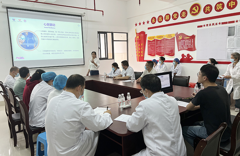 活动中,陈广琴向卫生院医务人员详细讲解了房颤中心的建设意义及实施流程,分享了房颤的诊断与规范治疗经验,解答了房颤治疗过程中的系列关键知识。黎燕护士长以《心心向荣,护佑健康》为题进行护理知识宣讲,向大家介绍工作中切实有效的中医护理技术及中医外治方法,与大家分享了中医药在临床护理实践中的心得与体会。吴福佳医师以《多重利器加持,终克心衰难关》为题,分享了科室房颤合并心衰患者,住院期间经CRTD(三腔永久起搏器)植入治疗联合优化药物方案逆转心衰结局的优秀案例。