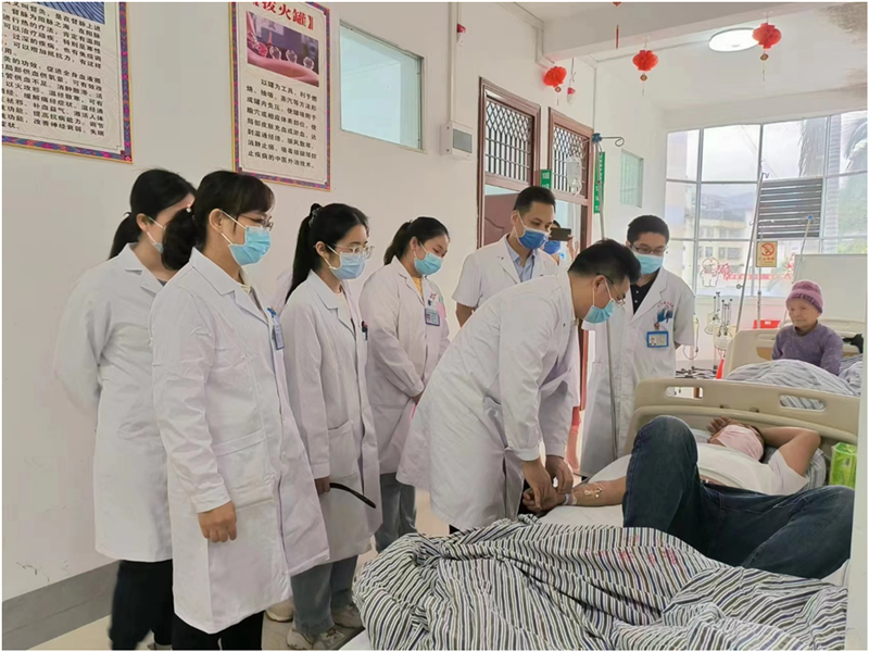 龙富立主任医师进入中医内科病区进行教学查房,与相关科室医护人员共同探讨疑难病例的中西医协同诊疗方案,对学科目前存在的问题提出意见和建议。