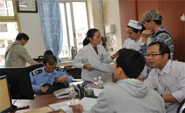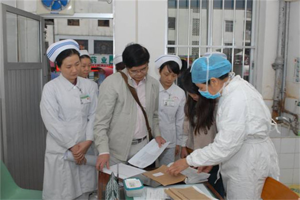 2013年11月20日上午,在南宁市疾病预防控制中心朱荣健科长的带领下,南宁市疾病控制工作督导组一行12人到一附院进行2013年疾病控制工作检查,一附院医务部、护理部、预防保健科、医院感染管理科、门诊部、后勤部、检验科、放射科、设备科等部门一起参加了迎检工作。