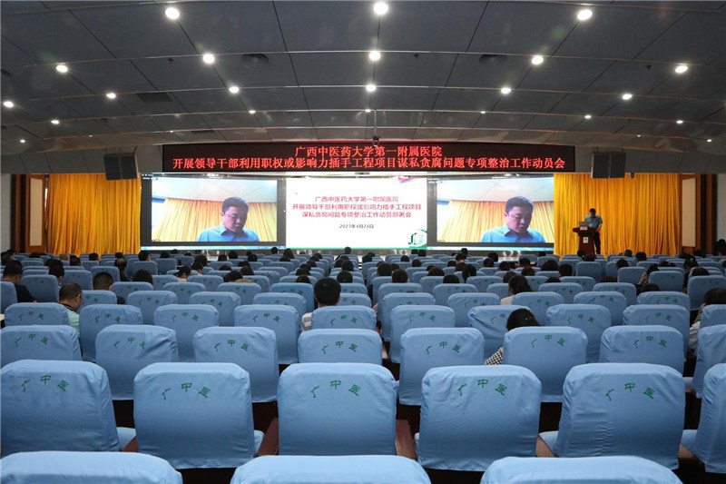 为进一步学习贯彻党的二十大精神,深化“清廉广中医”建设,4月24日下午,一附院党委在东葛院区住院楼5楼多功能学术报告厅召开领导干部违规插手工程项目谋私贪腐问题专项整治工作动员部署会,仙葫院区设置分会场同步直播。一附院领导桂雄斌、谢胜、钟远鸣、周广林、卢健棋、毛德文、黄仲海、张高炼、苏泽凤以及中层干部、党(总)支部书记、支委、重点岗位人员400余人参会。