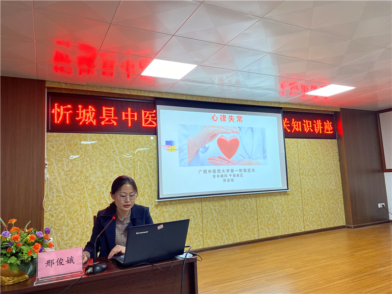4月25下午,名中医团队抵达忻城县中医医院会议室,结合本院职工实际情况及需求,邢俊娥副主任医师为该院约100名医护人员进行《从零开始学习心电图》的专题讲座。讲座从心电图的原理、心电活动的传导、各波形的意义等基础知识讲起,再到临床上常见的各类心律失常、急危重症心电图的特点的判断及处理,深入浅出,用通俗易懂的语言,因材施教。因内容较多,培训长达约3小时,但大家丝毫不感疲倦,讲座结束后内科医生说:“感谢邢老师的精彩讲座,让我们对心电图有了一定的认识,值班时判读危急重的心电图及处理患者再也不会手忙脚乱了......”。