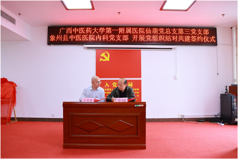 27日上午,活动在象州县中医医院业务综合后13楼大会议室正式开始,活动由象州县中医医院副院长罗宁主持。广西名中医周宾宾主任医师及象州县中医医院李长龄院长分别做了致辞。随后,星空彩票老版本下载第一附属医院仙葫党总支第三党支部书记王开龙和象州县中医医院内科党支部书记李敏签订党建共建结对协议书。签约仪式结束后星空彩票老版本下载第一附属医院和象州县中医医院组建康复医学科专科联盟揭牌仪式一并举行。